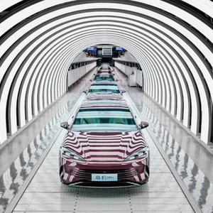 在比亞迪工廠(chǎng)焊接車(chē)間,記者看到,數十臺機器人手臂組成一個(gè)焊接流水線(xiàn)。一架架已焊接成型的車(chē)身被自動(dòng)傳送至涂裝車(chē)間,在完成涂裝后又被傳送至總裝車(chē)間。S形的拼裝線(xiàn)上,一輛輛新款汽車(chē)被組裝完成并下線(xiàn)。