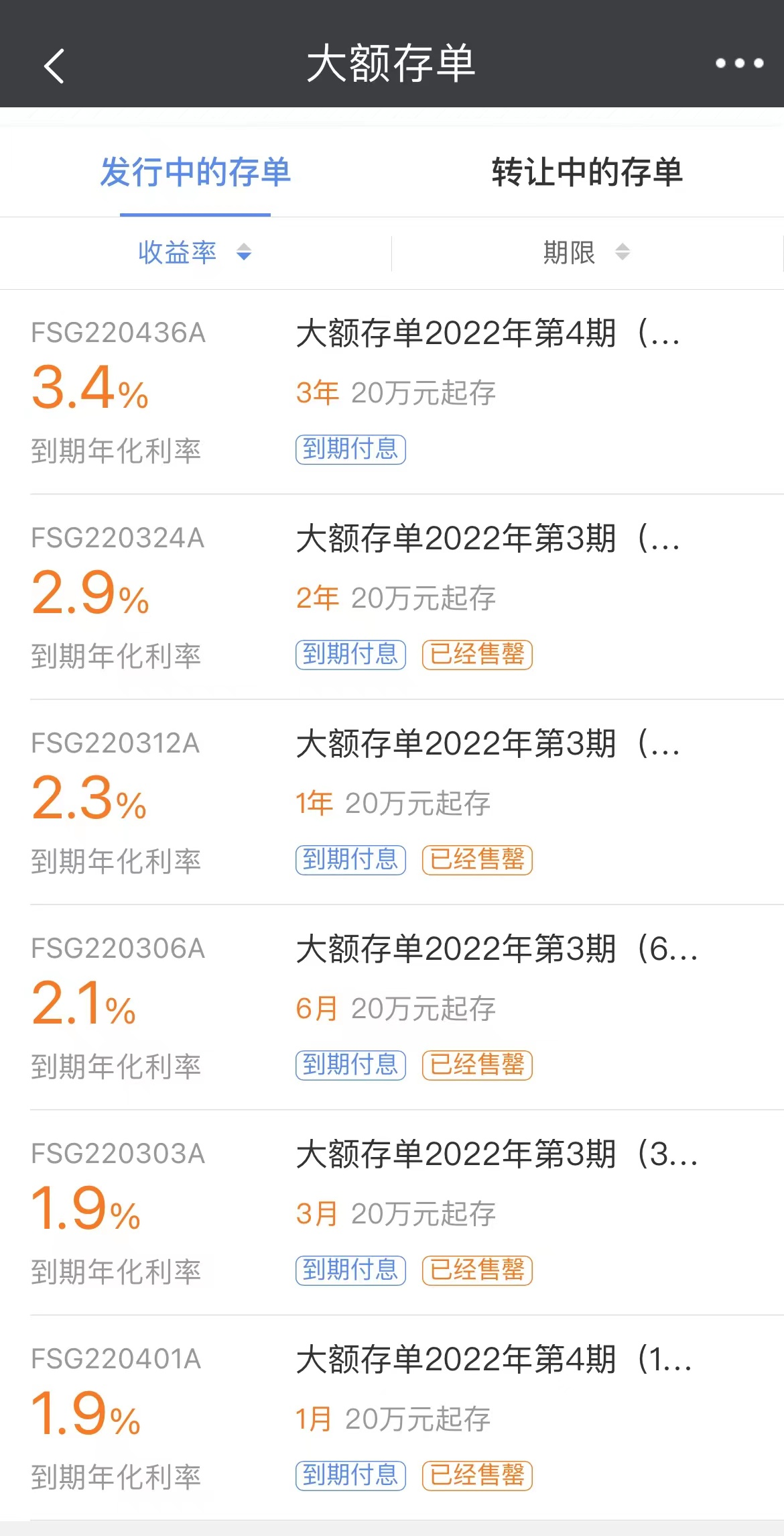 記者通過(guò)銀行網(wǎng)點(diǎn)實(shí)地走訪(fǎng)、App查詢(xún)等方式了解到,在售大額存單中很難見(jiàn)到年利率在3.5%以上的產(chǎn)品。不少銀行1年期、2年期、3年期的大額存單額度較為緊張,甚至部分產(chǎn)品已售罄。
