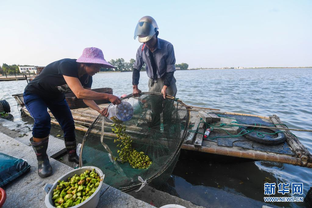 8月19日,在浙江省嘉興市秀洲區油車(chē)港鎮西千畝蕩,菱農們清洗剛采摘的菱角。