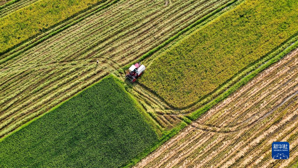 8月23日,在湖南省衡陽(yáng)市常寧市板橋鎮樟塘村,農民駕駛收割機在收割中稻(無(wú)人機照片)。