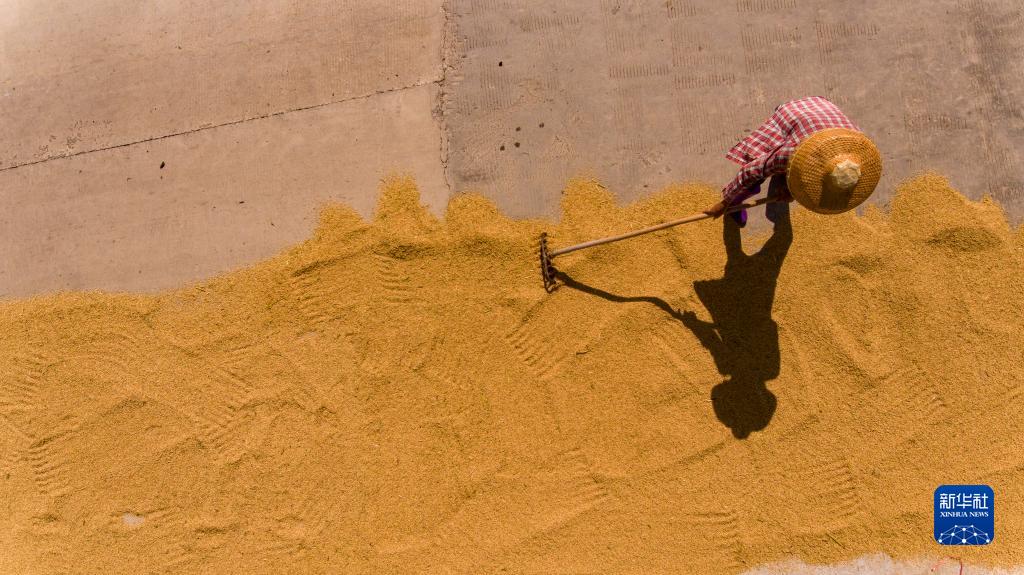 8月23日,海南省瓊海市潭門(mén)鎮福田村的農民在晾曬稻谷(無(wú)人機照片)。