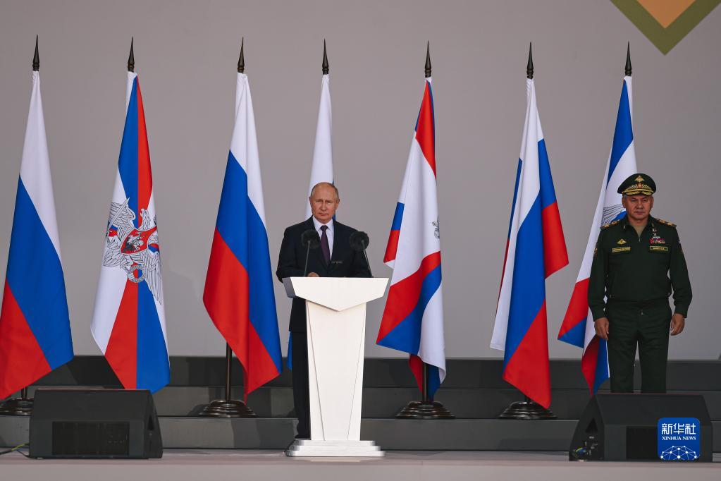 8月23日,俄羅斯總統普京(左)在莫斯科愛(ài)國者公園舉行的“國際軍事比賽-2021”開(kāi)幕式上致辭。