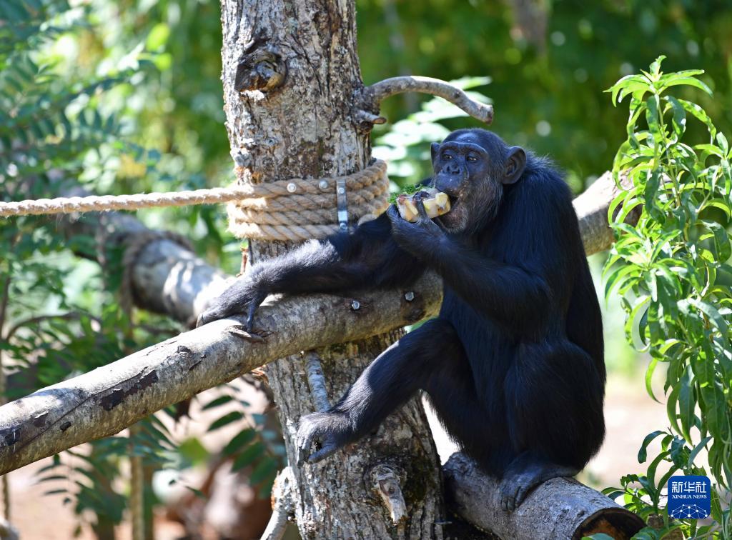 8月26日,一只黑猩猩在意大利羅馬動(dòng)物園享用冰凍食物。