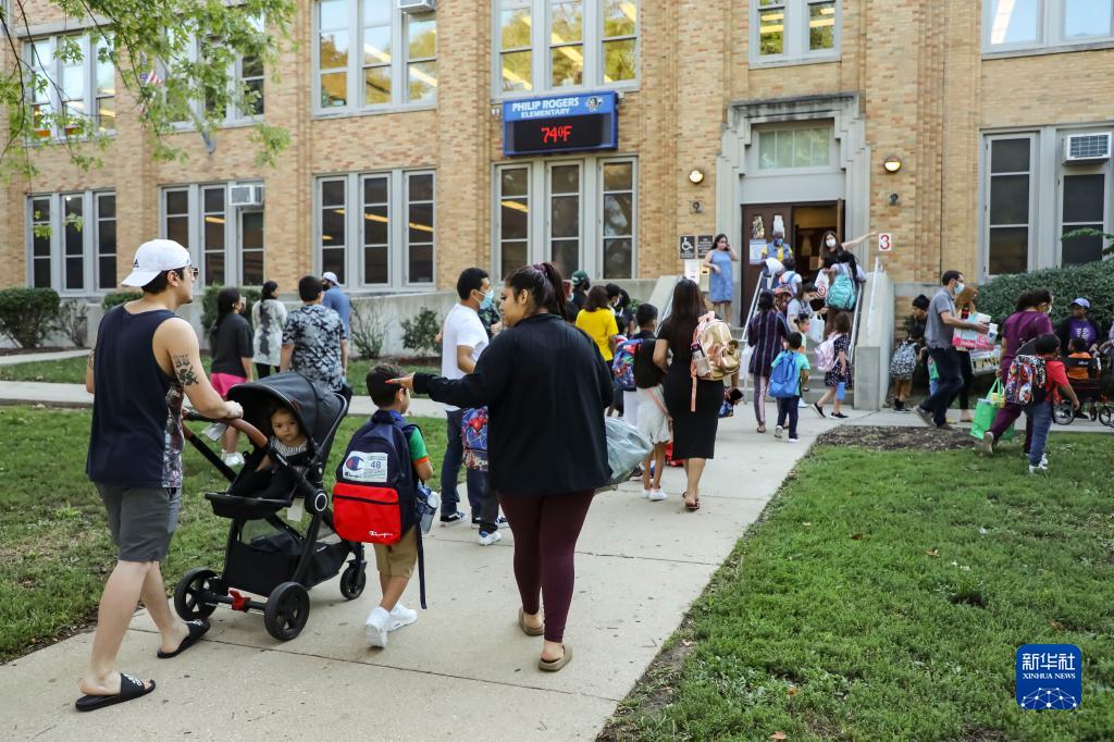 8月30日,在美國芝加哥,家長(cháng)在開(kāi)學(xué)日送孩子上學(xué)。