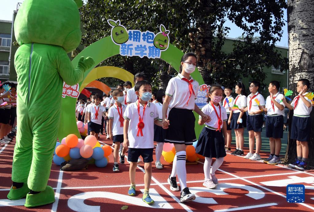 9月1日,在北京市海淀區太平路小學(xué),六年級學(xué)生帶領(lǐng)一年級新生走入開(kāi)學(xué)典禮現場(chǎng)。