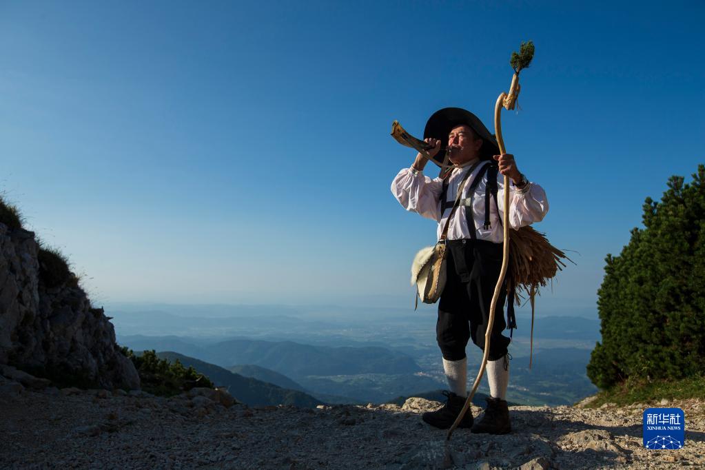 9月8日,斯洛文尼亞維利卡普拉尼那高地的老牧民彼得身著(zhù)傳統服飾在吹牛角號。
