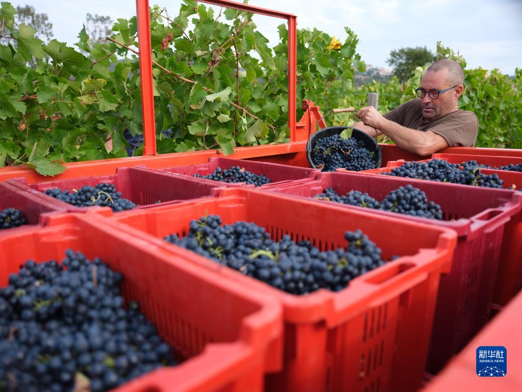 9月9日,在法國南部濱海阿爾卑斯省的芒德略拉納普勒,果農采摘用來(lái)釀酒的葡萄。