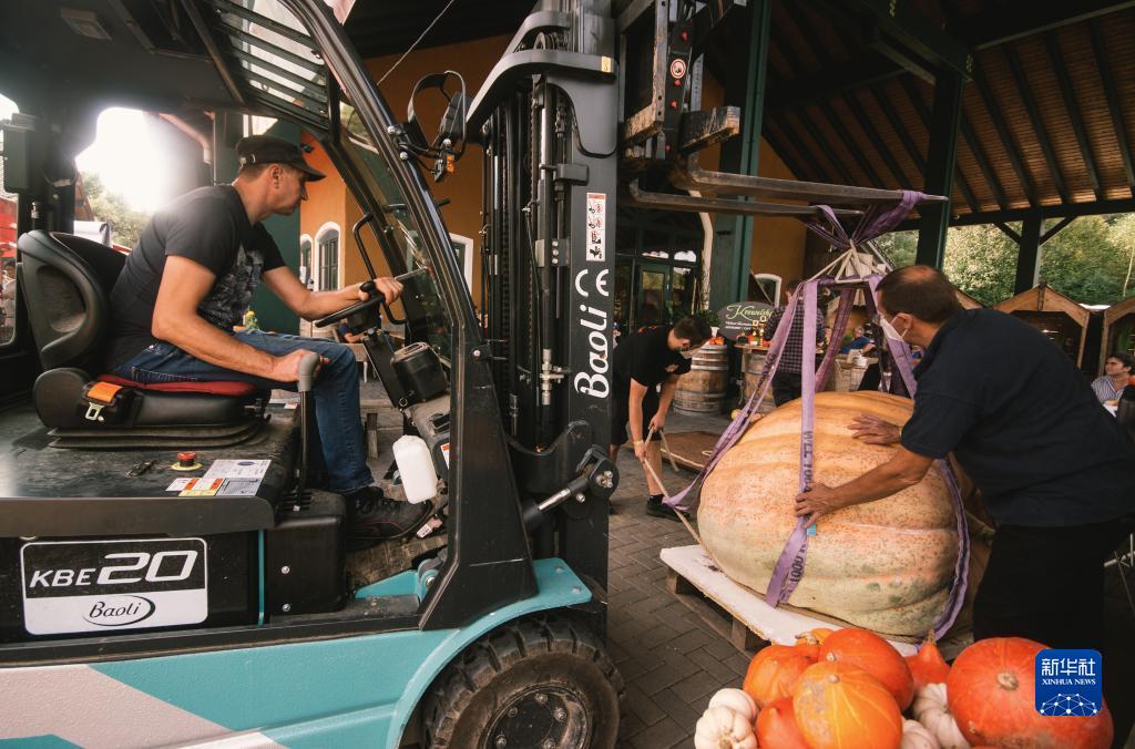 9月12日,在德國洛馬爾傳統南瓜節上,工作人員用鏟車(chē)給一個(gè)南瓜稱(chēng)重。