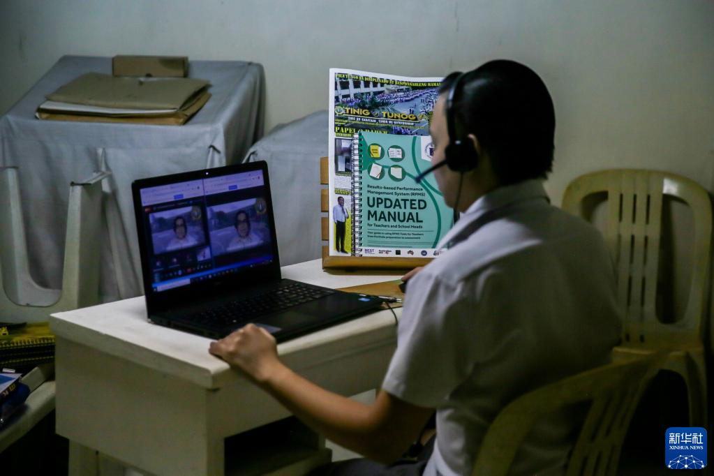 9月13日,在菲律賓馬尼拉,教師卡爾文·埃羅爾·阿爾坎塔拉在2021-2022學(xué)年開(kāi)學(xué)第一天通過(guò)網(wǎng)絡(luò )為學(xué)生上課。當日,菲律賓教育部門(mén)通過(guò)網(wǎng)絡(luò )、電視和電臺等形式開(kāi)啟了新學(xué)年的教學(xué)。