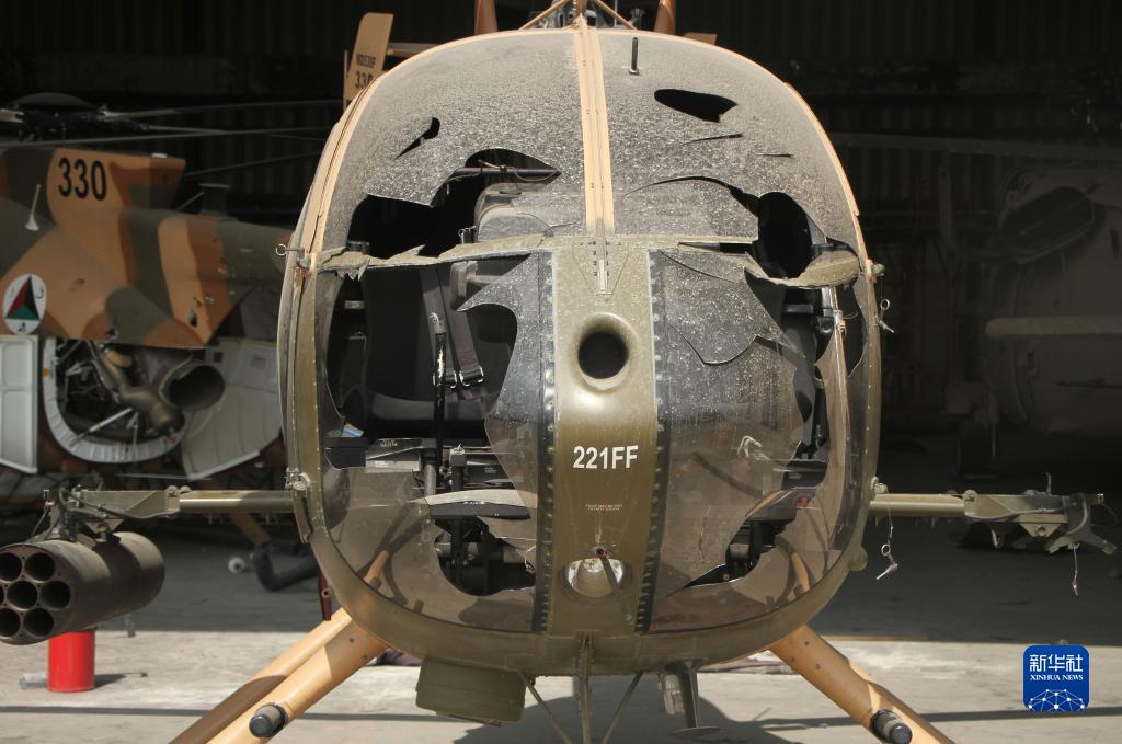 這是9月20日在阿富汗喀布爾機場(chǎng)拍攝的被毀壞的阿富汗空軍直升機。