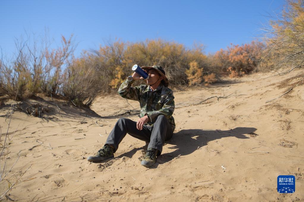 10月11日,護林員魏存廣在額濟納旗七道橋胡楊林區在巡護途中休息。新華社記者 李志鵬 攝