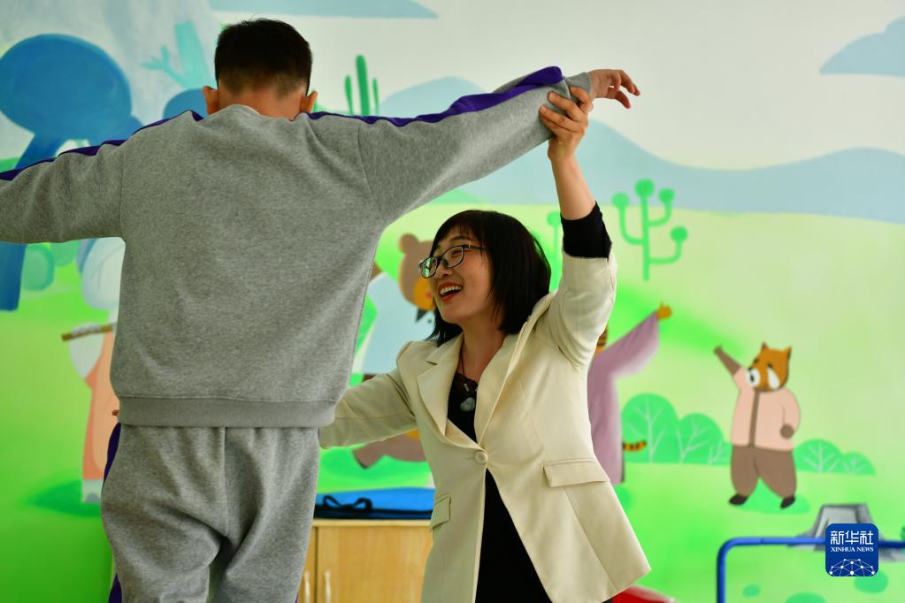 10月13日,張余敏(右)在海興縣特教學(xué)校內帶領(lǐng)一名學(xué)生進(jìn)行感統訓練。