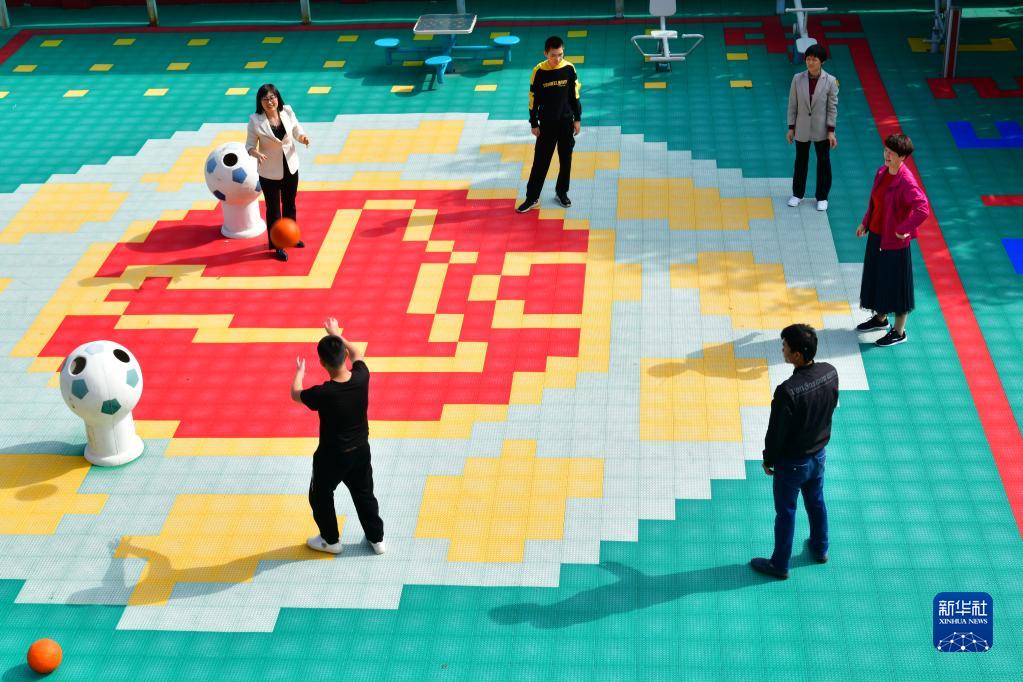 10月13日,張余敏(左一)在海興縣特教學(xué)校操場(chǎng)上和學(xué)生進(jìn)行球類(lèi)運動(dòng)。