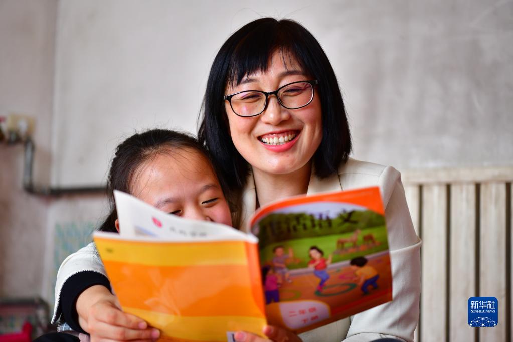 10月13日,在海興縣香坊鄉北王村,張余敏(右)在為一名學(xué)生讀課文。