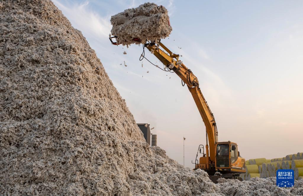 在新疆沙灣市的一家棉花收購廠(chǎng),工人把剛收購的新棉堆垛(10月20日攝)。新華社記者 胡虎虎 攝