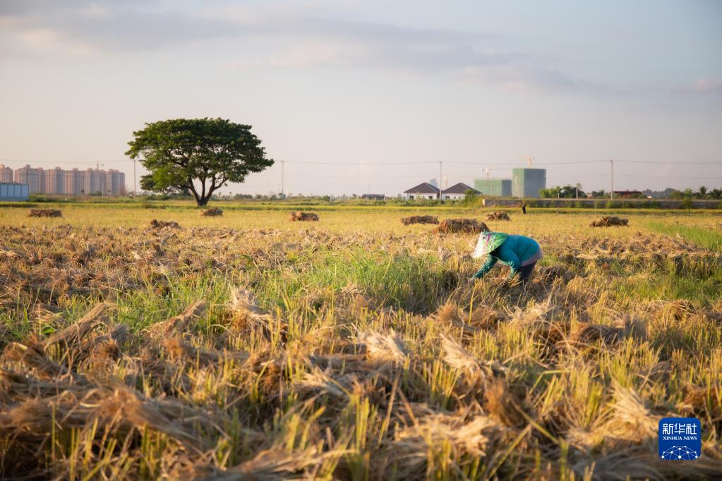 10月25日,農民在老撾萬(wàn)象城邊的田地里收割稻谷。