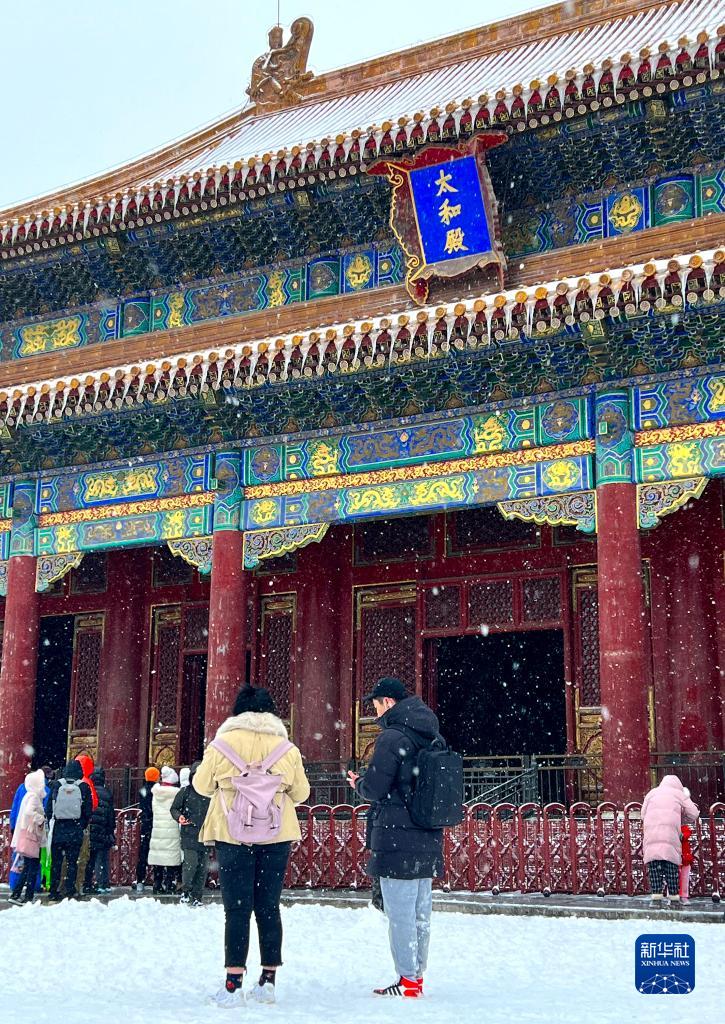 11月7日,游人在雪中游覽故宮。