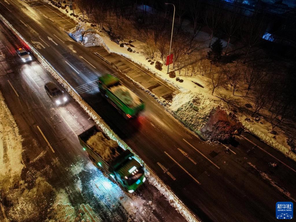 11月11日晚,在通遼市城區,作業(yè)車(chē)輛連夜清理積雪(無(wú)人機照片)。