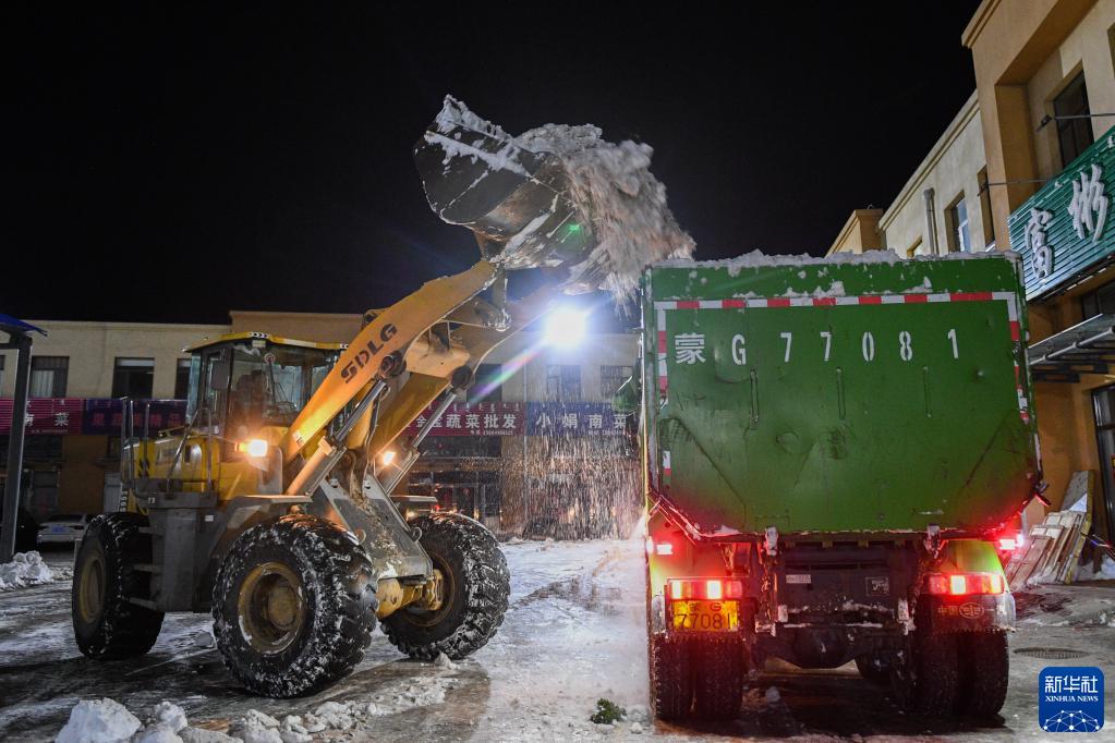 11月11日晚,在通遼市運達綠色農副產(chǎn)品批發(fā)市場(chǎng),作業(yè)車(chē)輛連夜清理積雪。