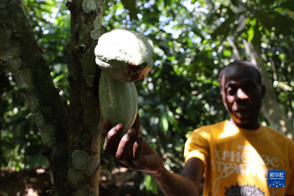 11月15日,在加納東部省的一處可可種植園,一名種植戶(hù)在查看可可果實(shí)。