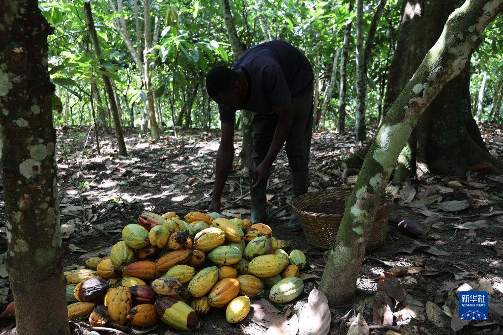 11月15日,在加納東部省的一處可可種植園,一名種植戶(hù)在整理可可果實(shí)。