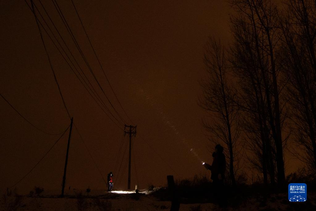11月21日晚,國網(wǎng)雞西供電公司的工人在雪中巡查線(xiàn)路。