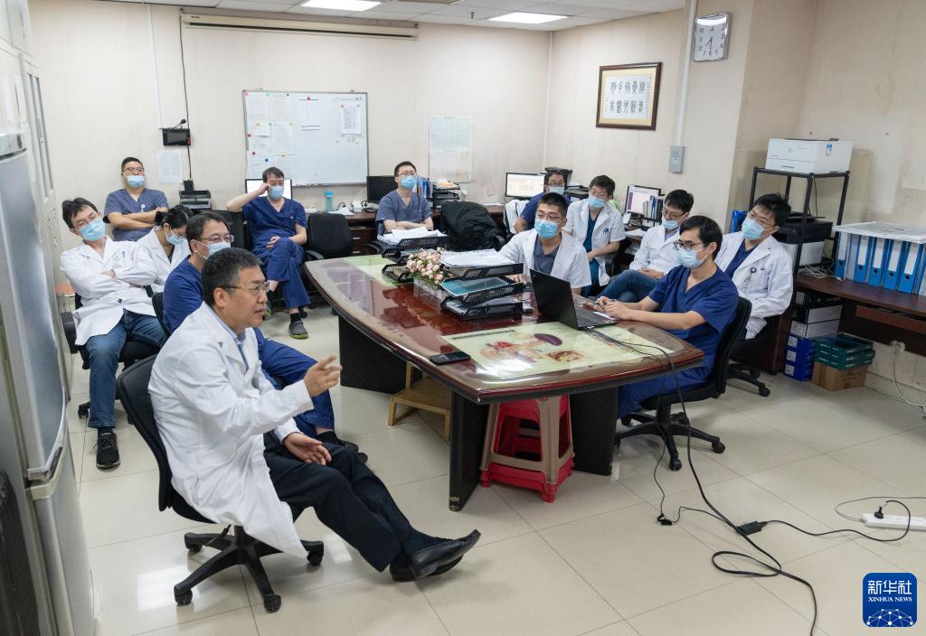 11月11日,在北京大學(xué)腫瘤醫院肝膽胰外一科醫生辦公室,邢寶才主任(左前一)組織每周一次的全科查房,討論沈建群等患者的手術(shù)方案。