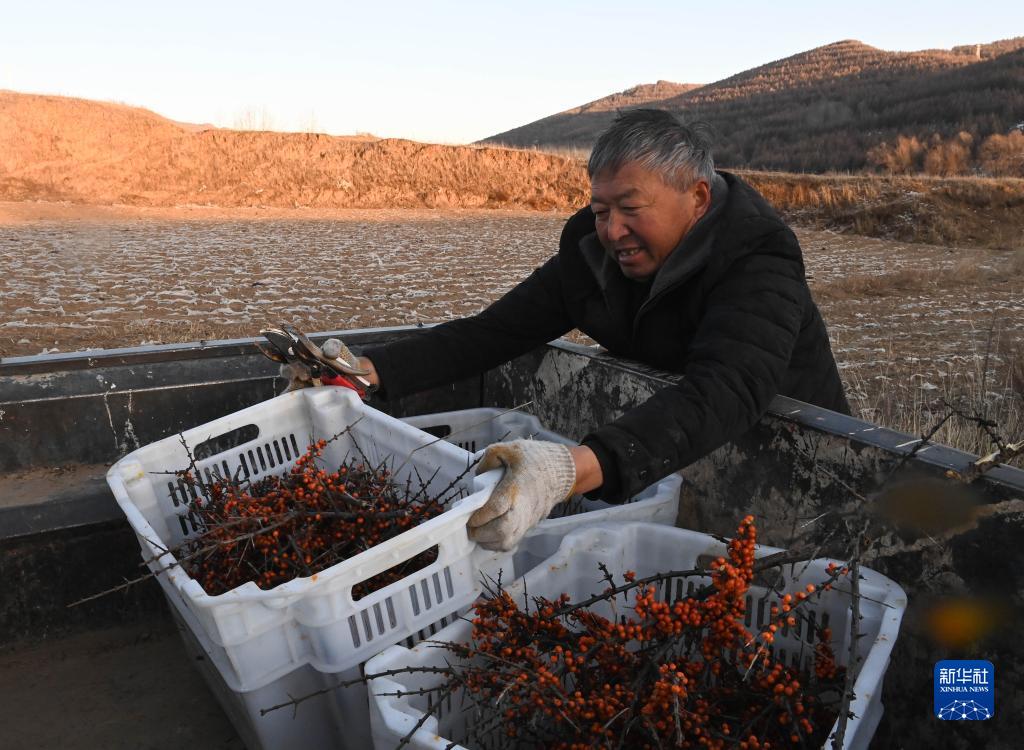 12月2日,在山西省嵐縣附近的山上,合作社成員將采摘好的野生沙棘搬運上車(chē)。新華社記者 柴婷 攝