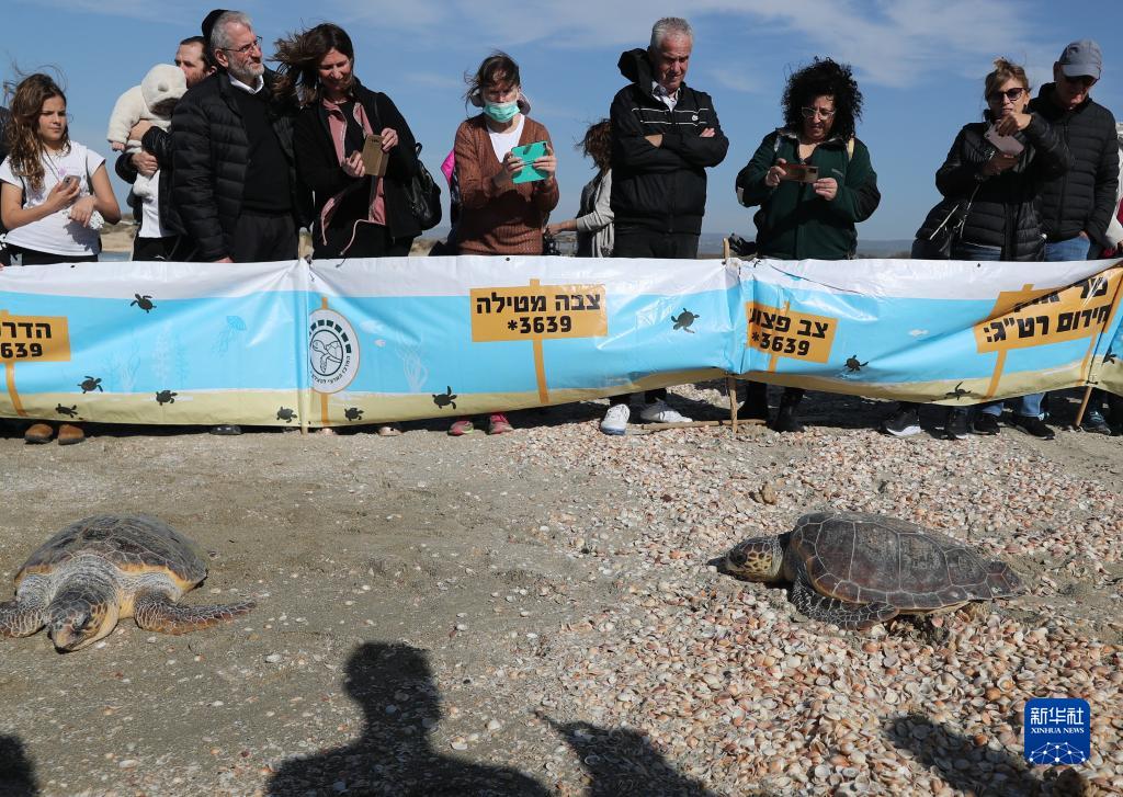 12月10日,在以色列北部城市海法附近的海灘,經(jīng)過(guò)以色列海龜救助組織治療后痊愈的海龜被放歸大海。