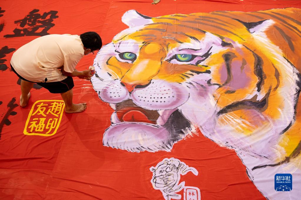 為迎接農歷虎年的到來(lái),文冬當地一家華人團體邀請畫(huà)家和學(xué)生一起創(chuàng )作了一幅11.5米長(cháng)、4.5米寬的老虎年畫(huà)。新華社發(fā)(張紋綜攝)