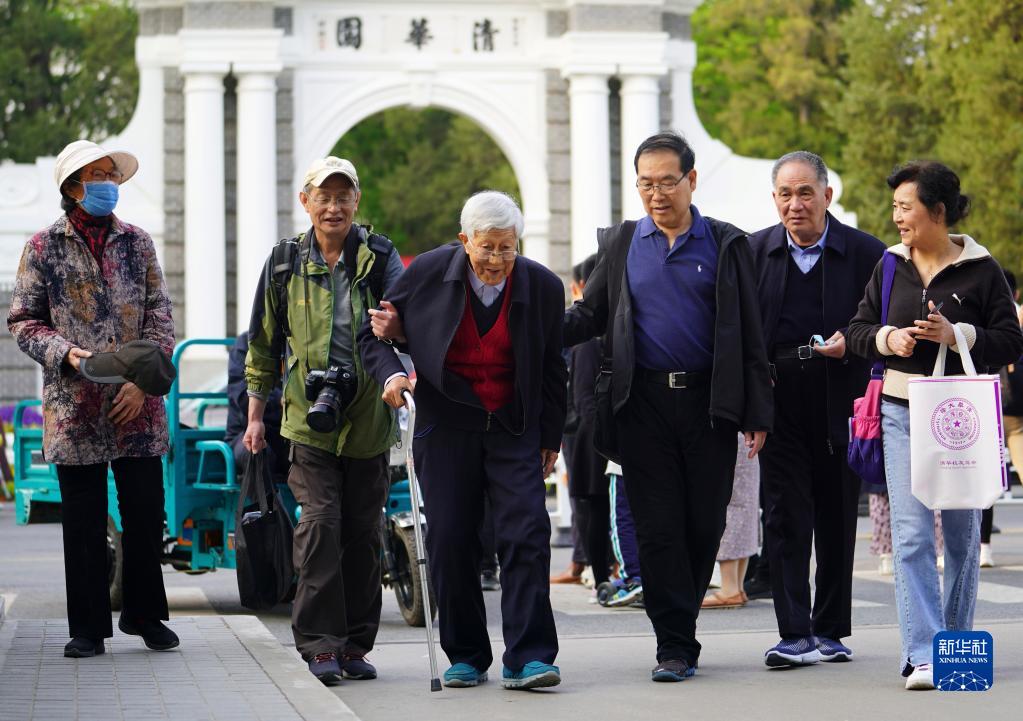 2021年4月24日,清華大學(xué)1976級無(wú)線(xiàn)電專(zhuān)業(yè)的學(xué)生和班主任謝宏毅老師(左三)在清華大學(xué)校園內邊走邊交流。2021年4月25日,清華大學(xué)迎來(lái)建校110周年紀念日。