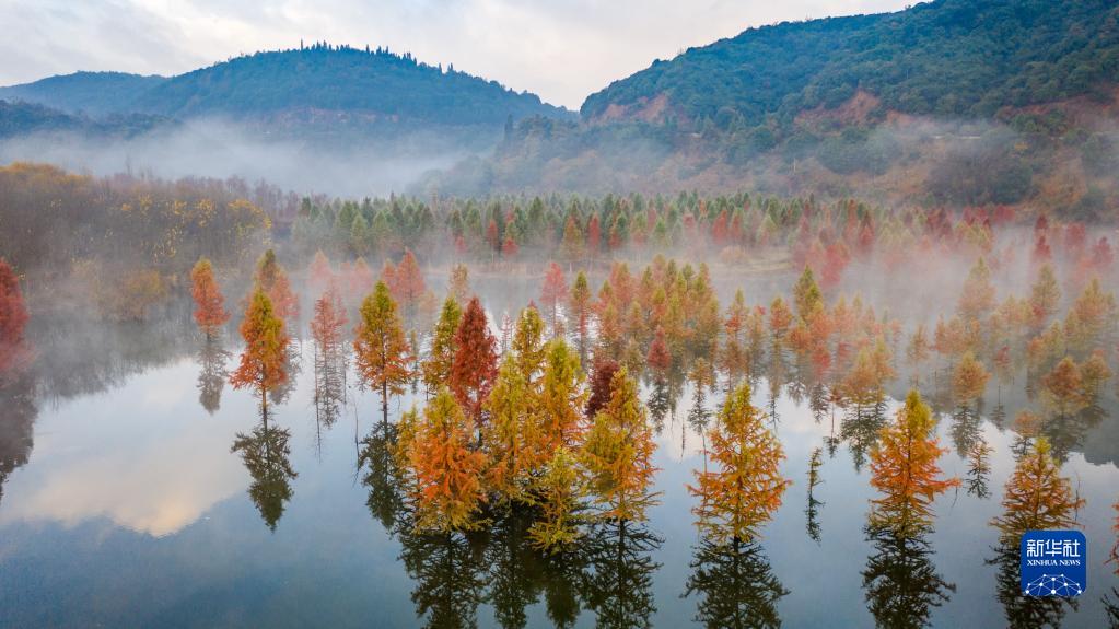 2021年12月10日拍攝的云南省昆明市盤(pán)龍區滇源街道甸尾村水杉濕地一景(無(wú)人機照片)。