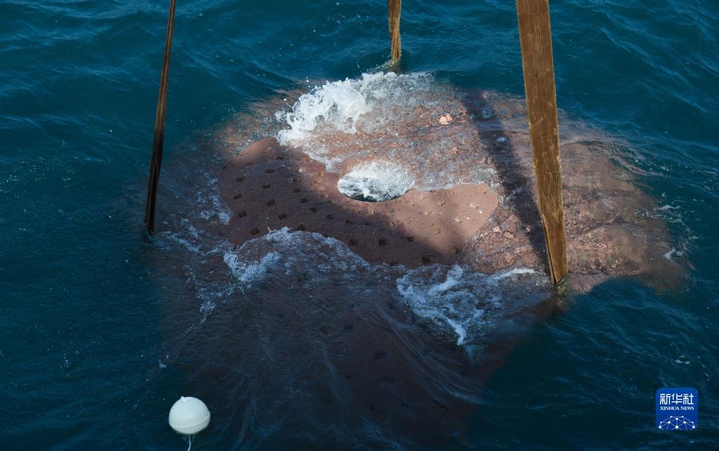 在亞龍灣相關(guān)海域,船上機械將人工生態(tài)礁吊入海中(1月19日攝)。