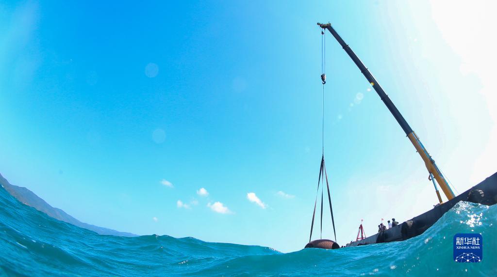 在亞龍灣相關(guān)海域,船上機械將人工生態(tài)礁吊入海中(1月19日攝)。