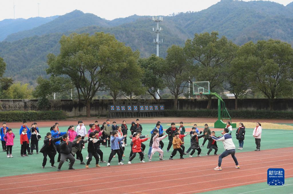 1月21日,在前童鎮中心小學(xué),童攀峰帶領(lǐng)學(xué)生們開(kāi)展舞獅基本動(dòng)作訓練。