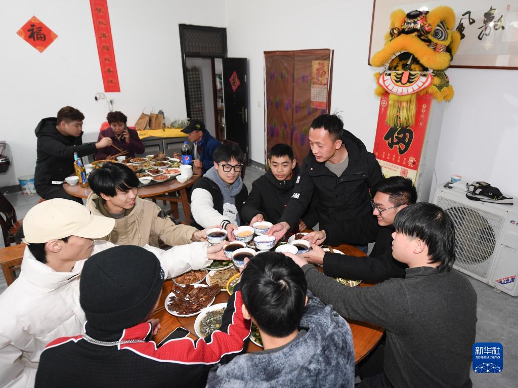 1月21日,在前童鎮橋頭楊村,童攀峰(站立者)在家里招待舞獅隊成員進(jìn)行年度聚會(huì )。