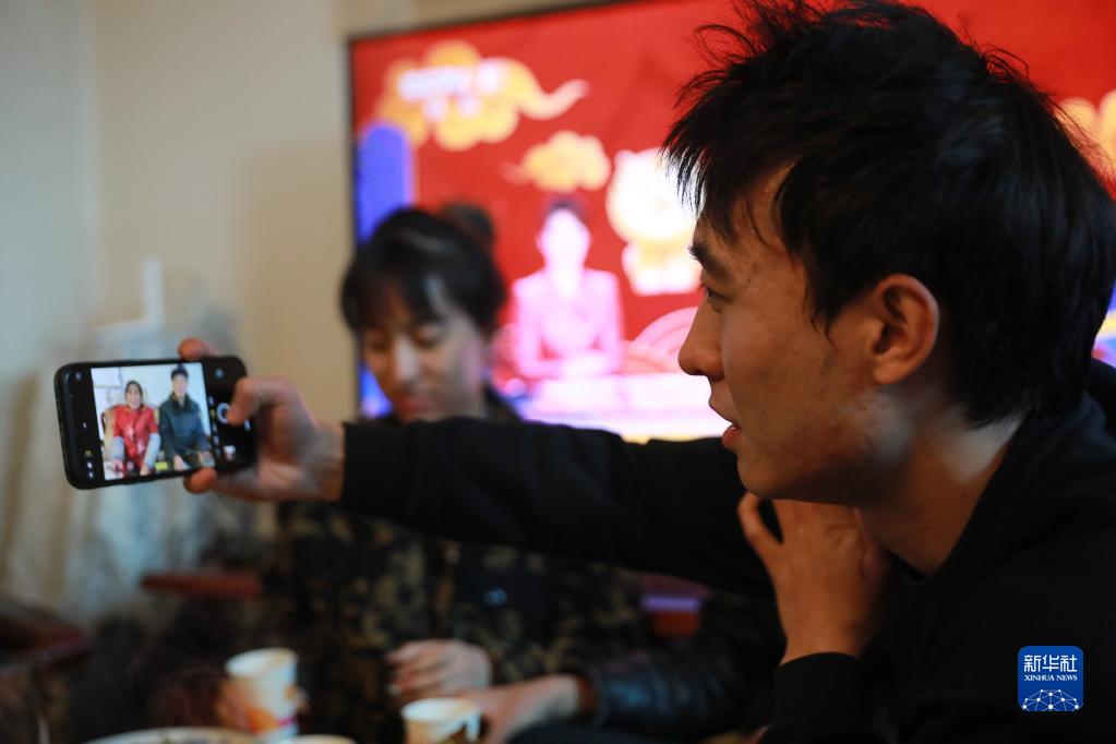 在蘭州市七里河區西果園鎮袁家灣村,村民張波(右)在家中給爺爺奶奶拍照(1月31日攝)。