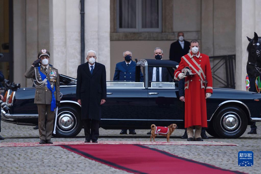 2月3日,在意大利羅馬,意大利總統馬塔雷拉(左二)抵達總統府時(shí),受到總統衛隊吉祥物小狗的迎接。