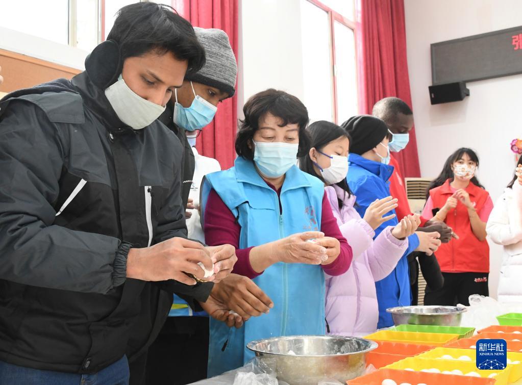 2月15日,在位于北京市海淀區中關(guān)村街道的華清園社區服務(wù)站,外國留學(xué)生與社區志愿者一起包湯圓。