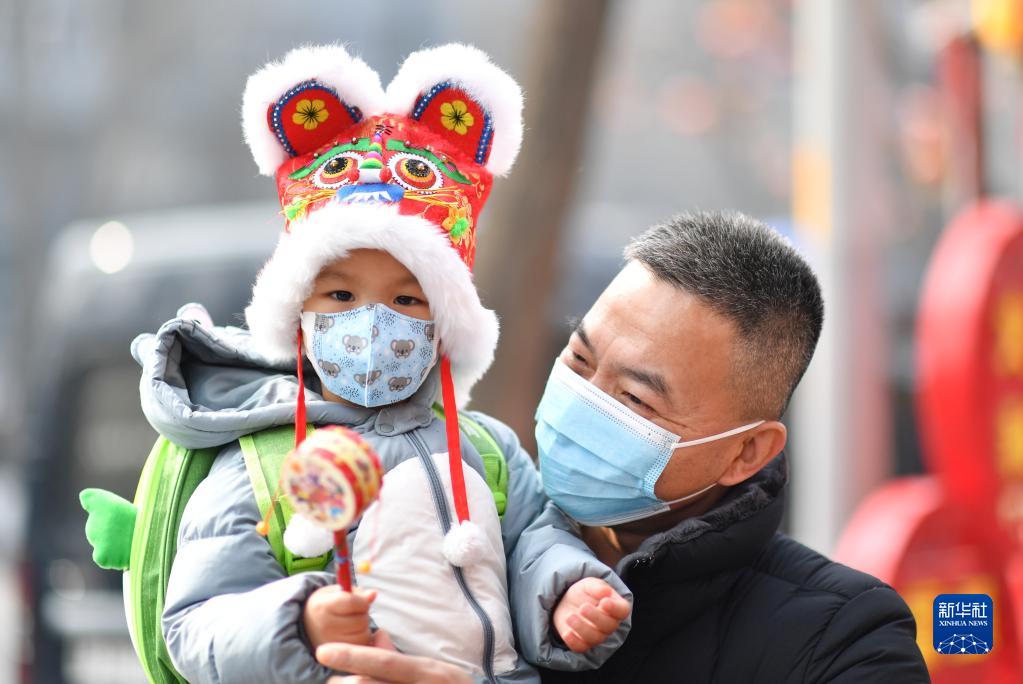 2月15日,戴著(zhù)虎頭帽的小朋友和家人在西安永興坊游覽。