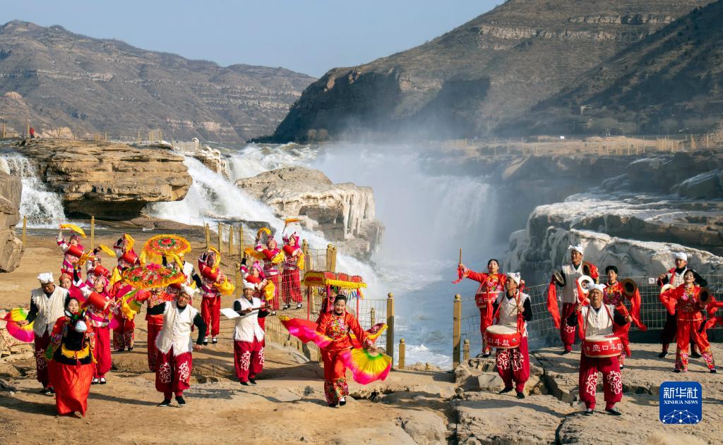2月15日,民俗藝人在陜西壺口瀑布景區進(jìn)行民俗表演。