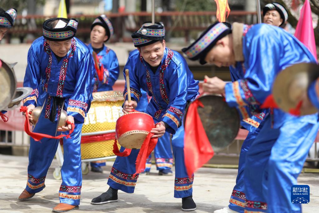 2月14日,民間藝人在貴州省黔東南苗族侗族自治州岑鞏縣羊橋土家族鄉楊柳村表演“土家戰鼓”。
