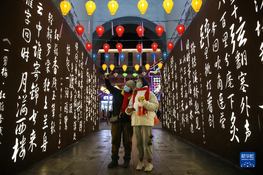 2月14日,游客在山東省濟南市槐蔭區印象濟南·泉世界迎春燈會(huì )參觀(guān)游玩。