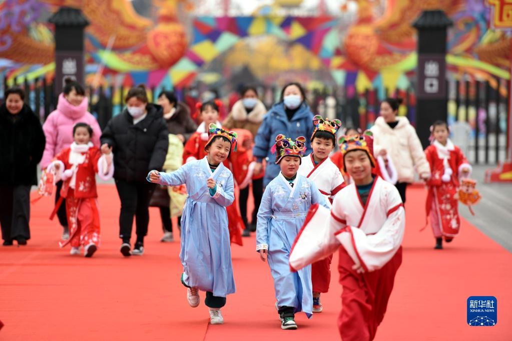 2月15日,孩子們在山東省臨沂市郯城縣郯國古城景區賞燈游玩。