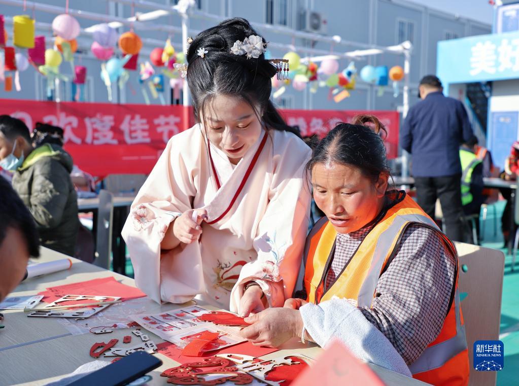 2月14日,中建七局西南公司云南分公司斗南花卉小鎮項目部的工人和管理人員一起做剪紙,共迎元宵佳節。