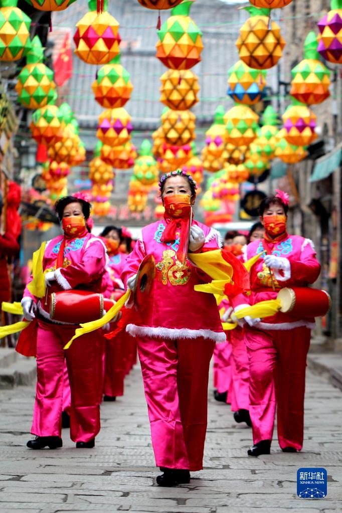 2月15日,在山東省淄博市周村古商城,女子腰鼓隊表演喜慶腰鼓。