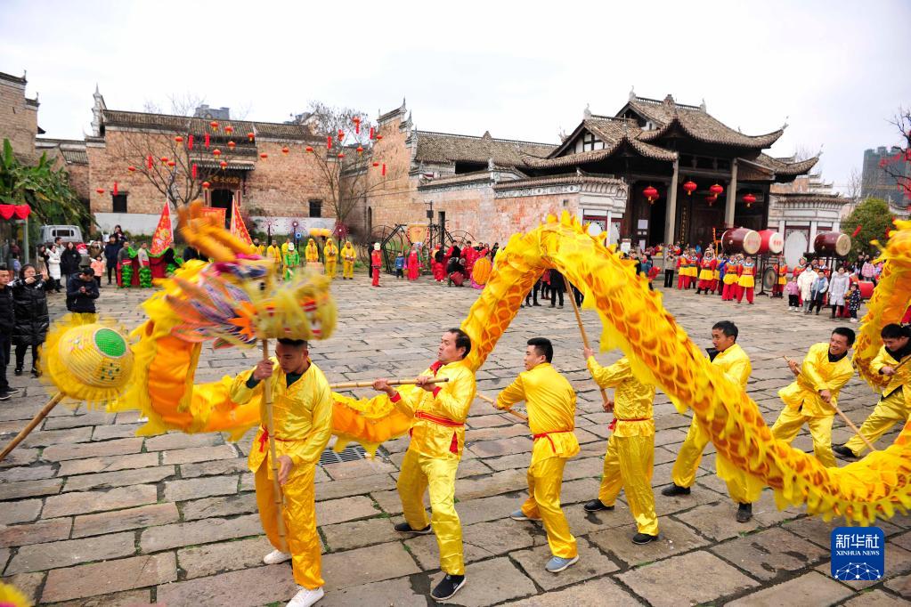 2月14日,在江西省宜春市萬(wàn)載縣萬(wàn)載古城,民間藝人在表演舞龍。