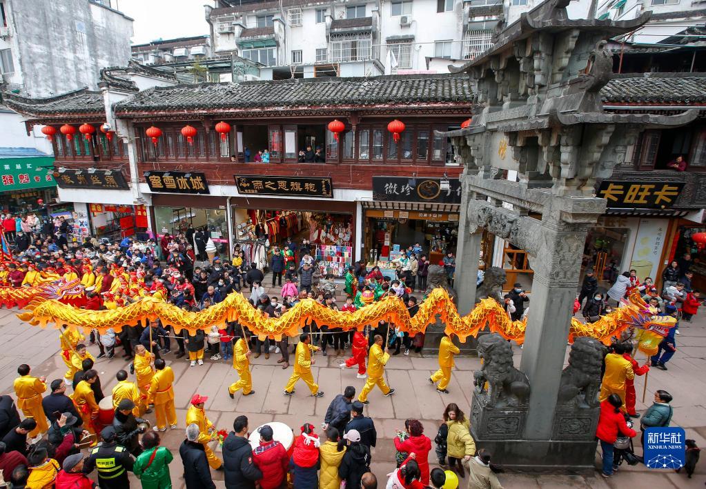2月15日,在安徽黃山,民俗表演隊伍在屯溪老街進(jìn)行踩街表演。