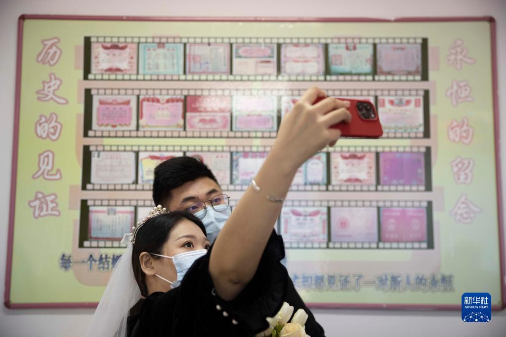 2月22日,在哈爾濱市道里區民政局婚姻登記處,一對新人在拍照留念。
