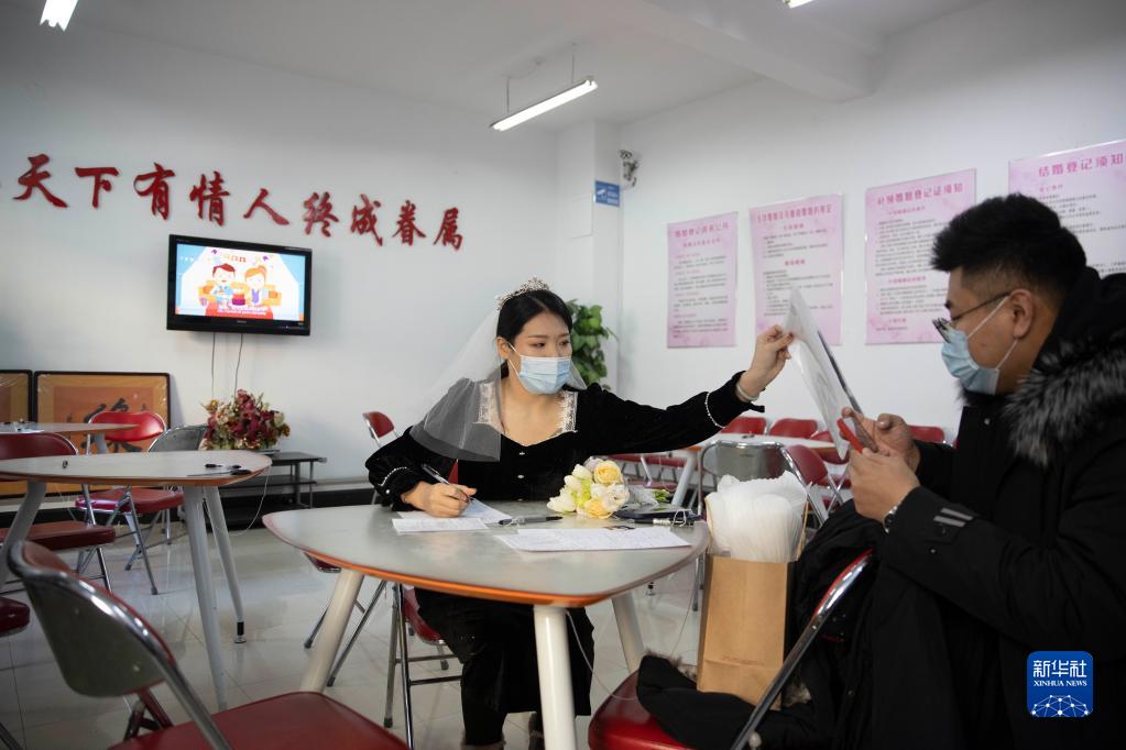 2月22日,在哈爾濱市道里區民政局婚姻登記處,新人在登記結婚。